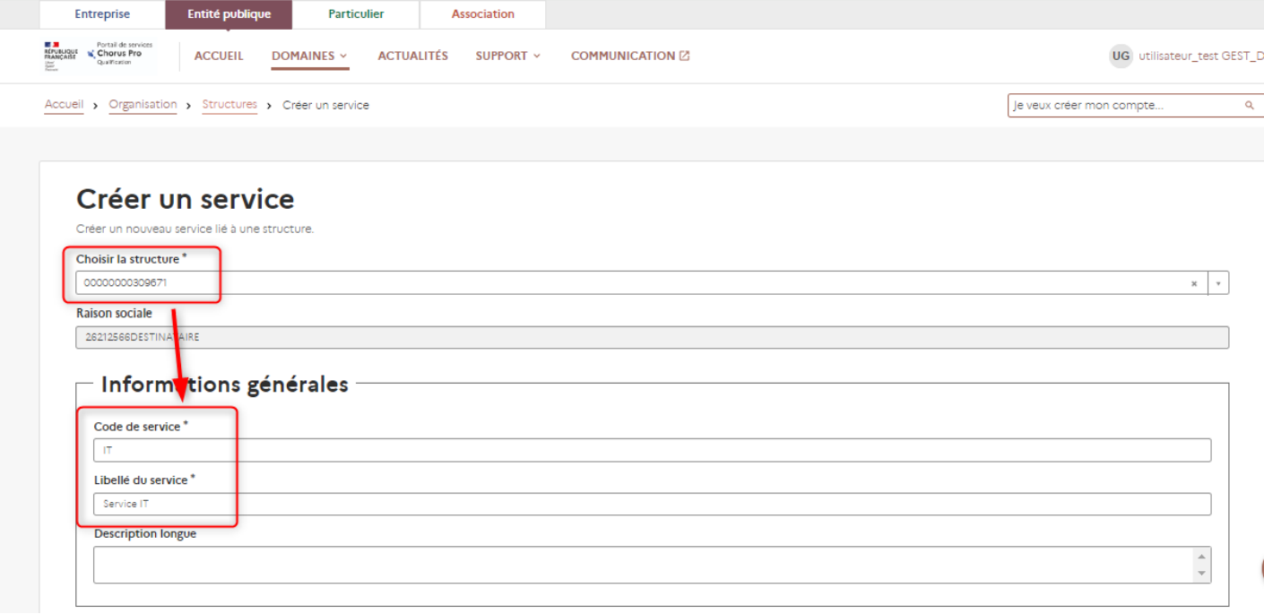 Plus bas, Renseignez le Code Service ainsi qu'un Libellé de service (compréhensible par les fournisseurs)